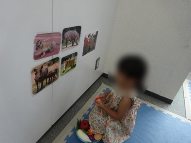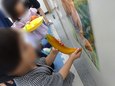 動物のイラストを用意し、その前におままごとの果物や野菜を置くと、子ども達は嬉しそうにしていました⭐