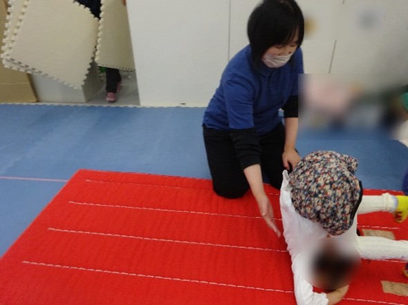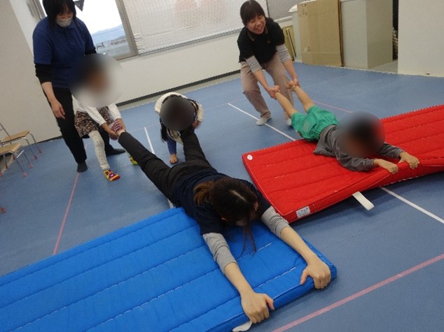 大根役と引っ張る役に分かれ、大根役はマットの縁にしがみつき体を踏ん張ります。