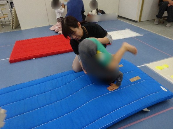前転では、手の付き方や体の丸め方の説明を受け、意識しながら一人ひとりが挑戦!