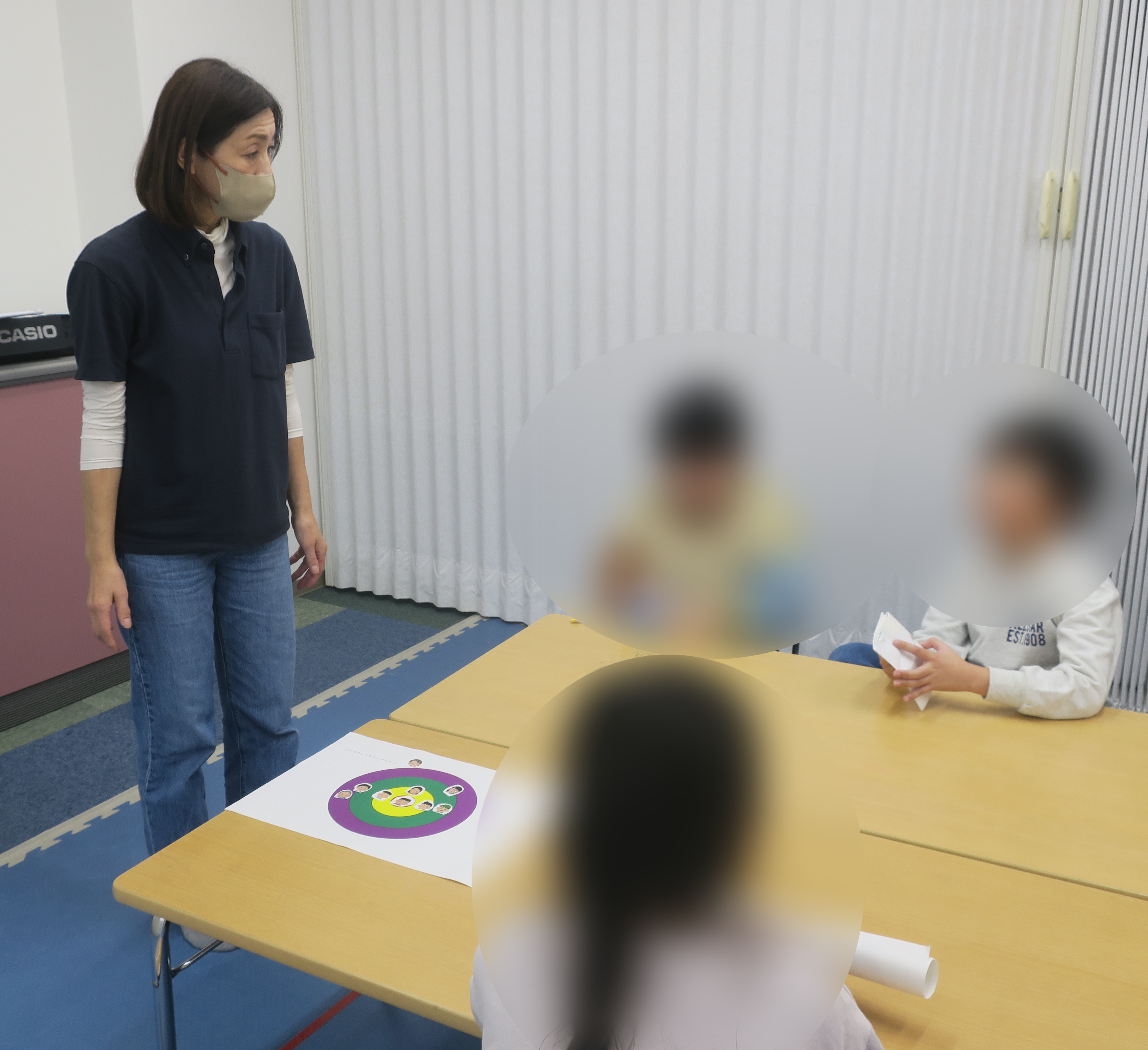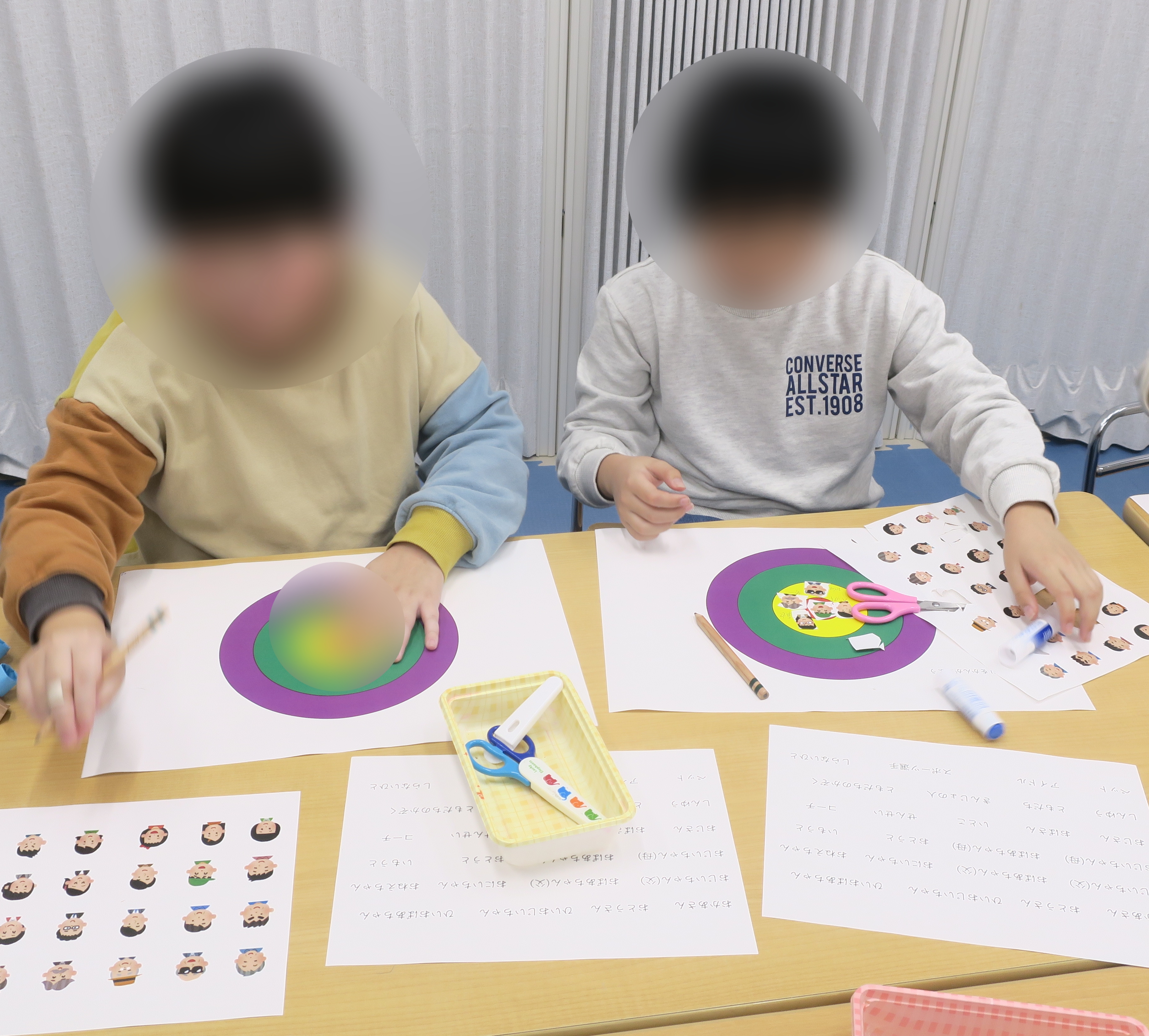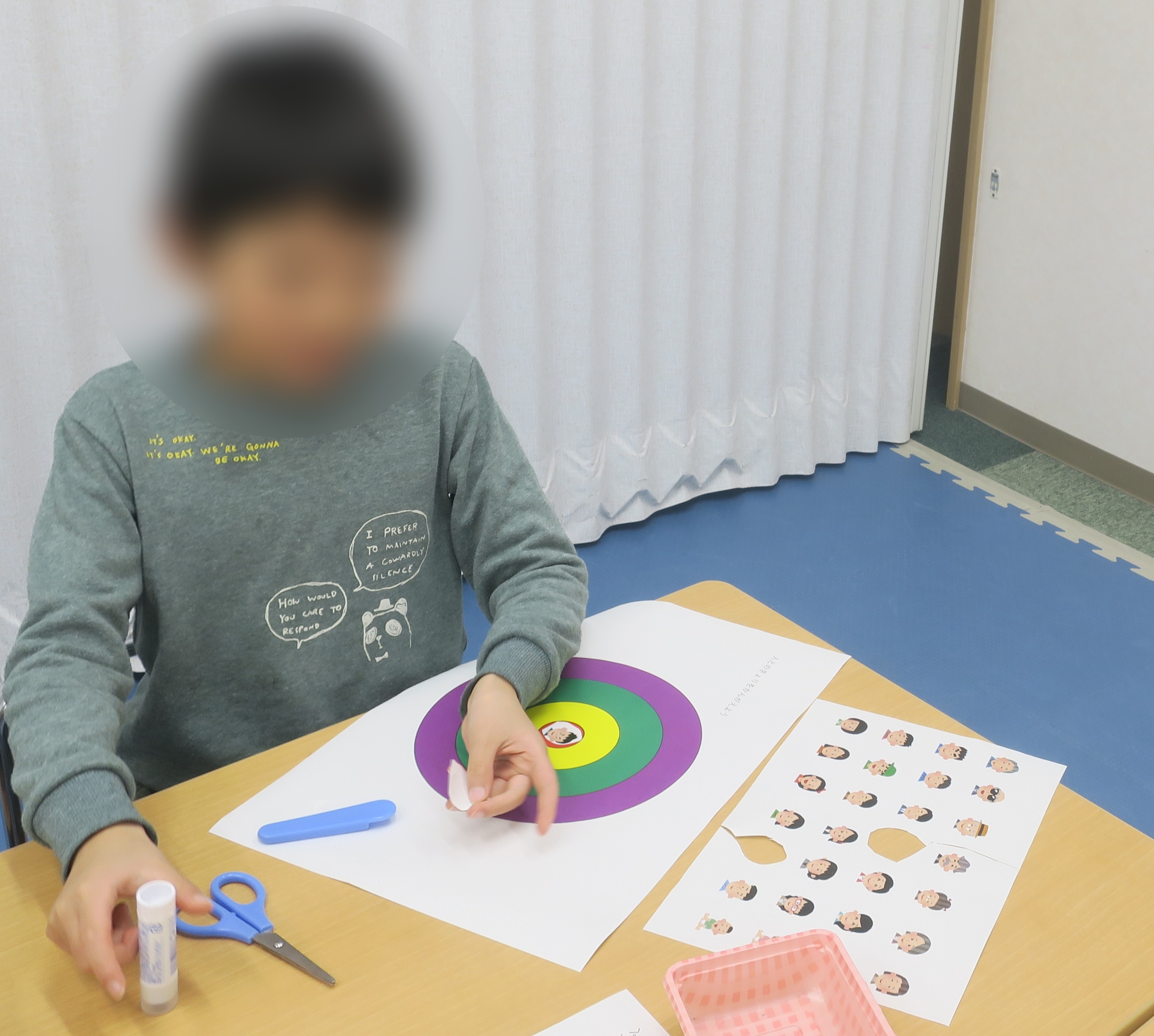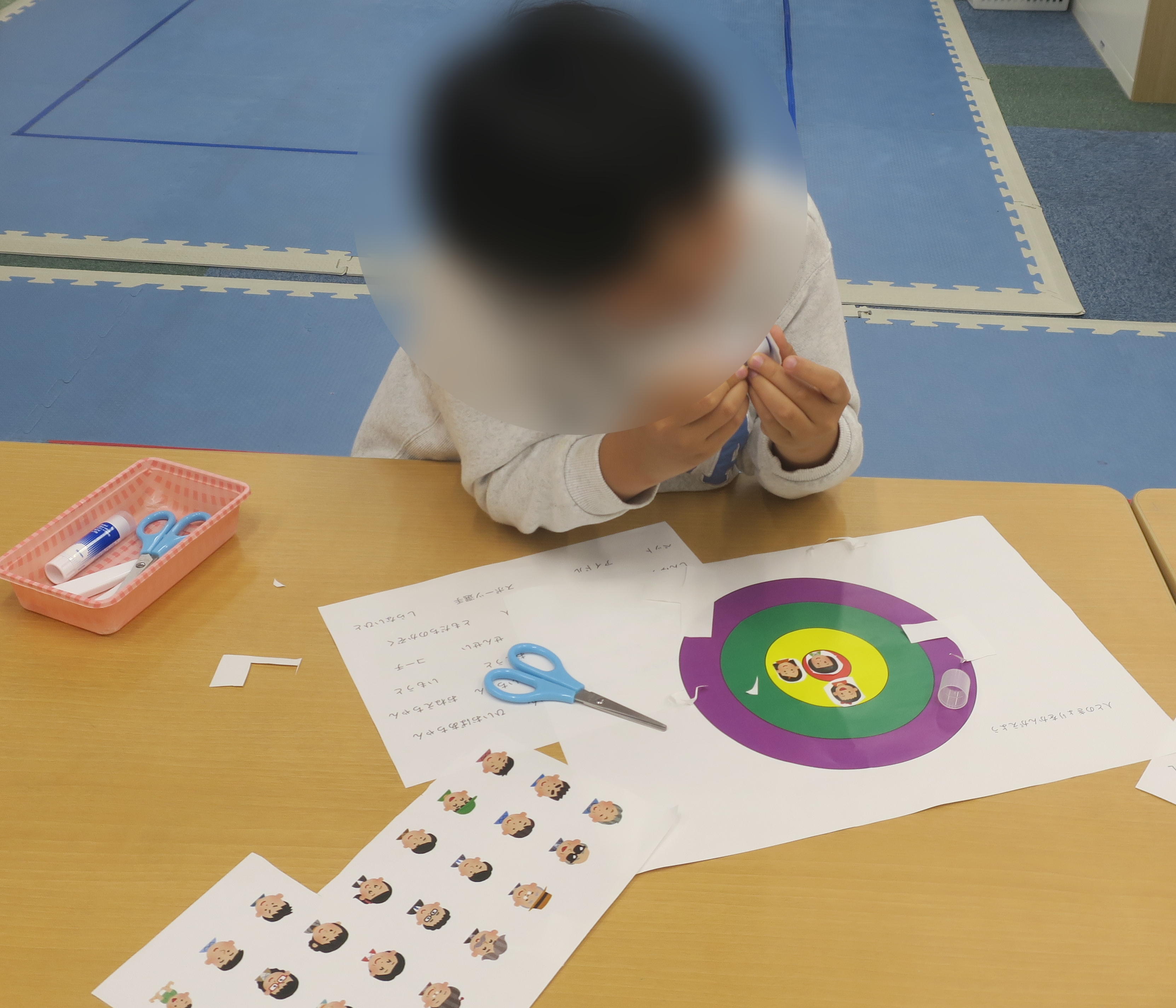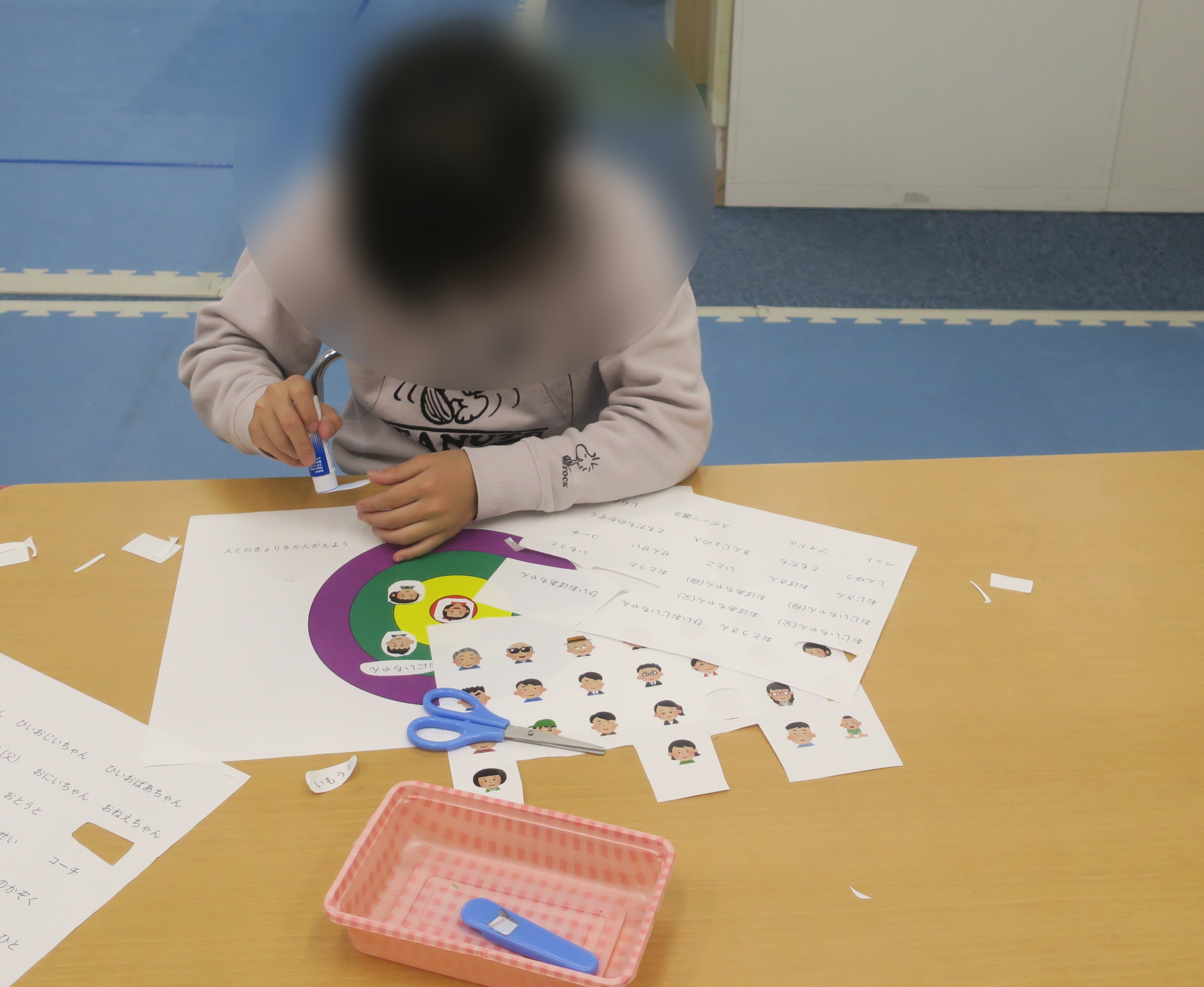 その後は人物のイラストを自分や家族、お友達に見立てて距離感を考えながらプリントに貼っていきました。