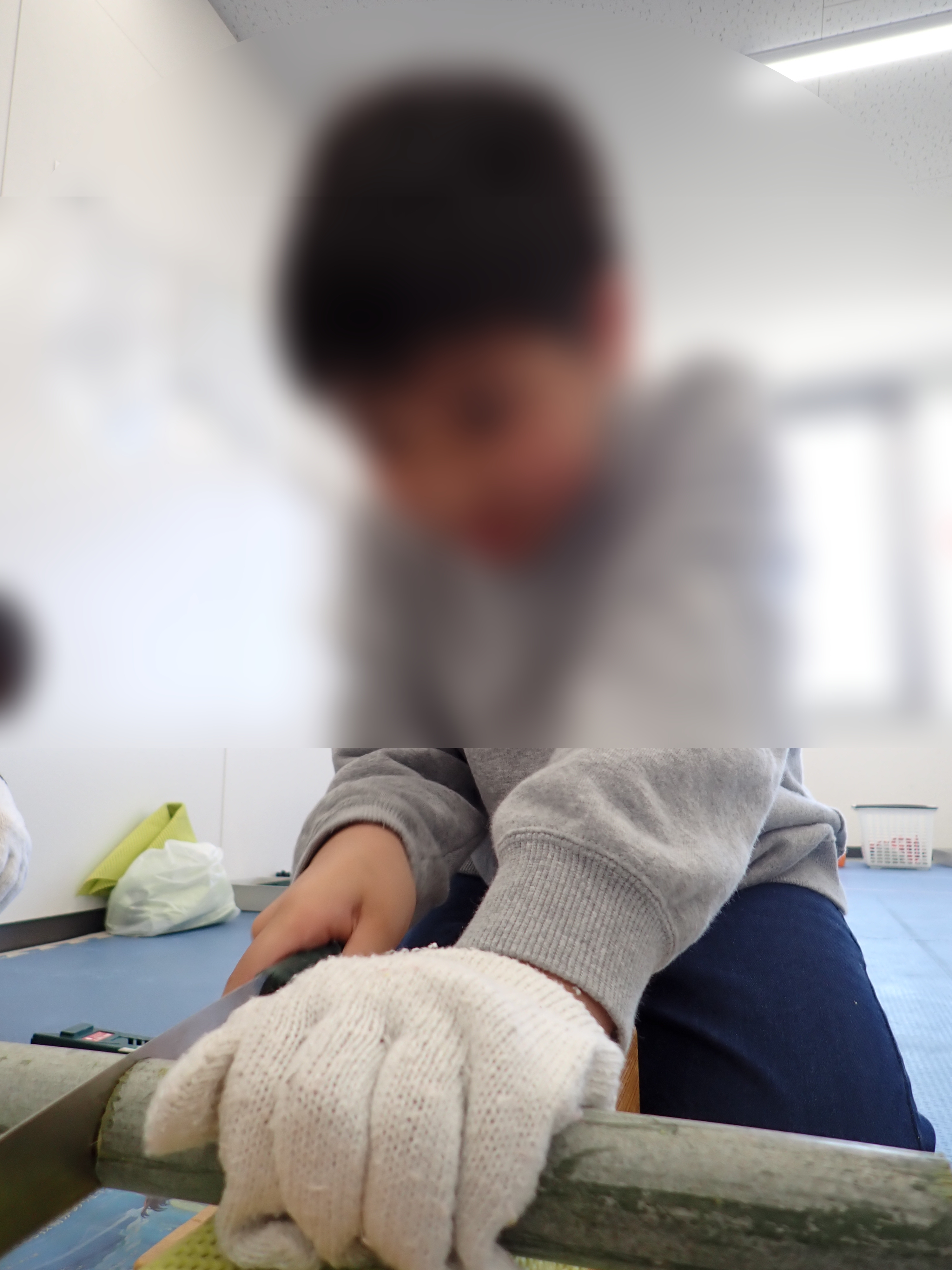 今回は竹を切って名札を作りました。竹をのこぎりで一生懸命切りました。初めてのこぎりを使う1年生もいましたが、ゆっくりと自分の力でやり遂げることができました。