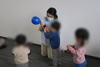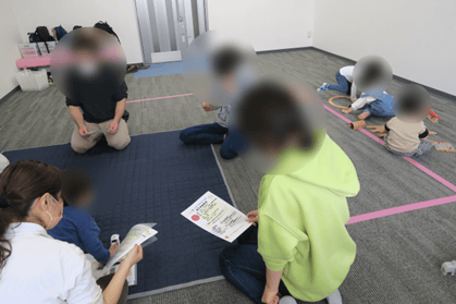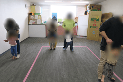 普段、ふれ愛の療育で子どもたちが楽しんでいるリズム遊びも取り入れてみました。音楽に合わせて寝転がったり、ハイハイやジャンプなどをしようとみんなでチャレンジしました。なかなかみんなで揃って動くことは難しかったですが、お母さんの協力もあってちょっとだけ頑張りました。でもやっぱりふれあい遊びの方が大好きでした!