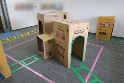 入室がドキドキするお友達も段ボールを見ると少しニコッとして入ってきてくれるトンネル遊びを3月も続けて遊びました。少し変化をつけるためにトンネルとトンネルの間