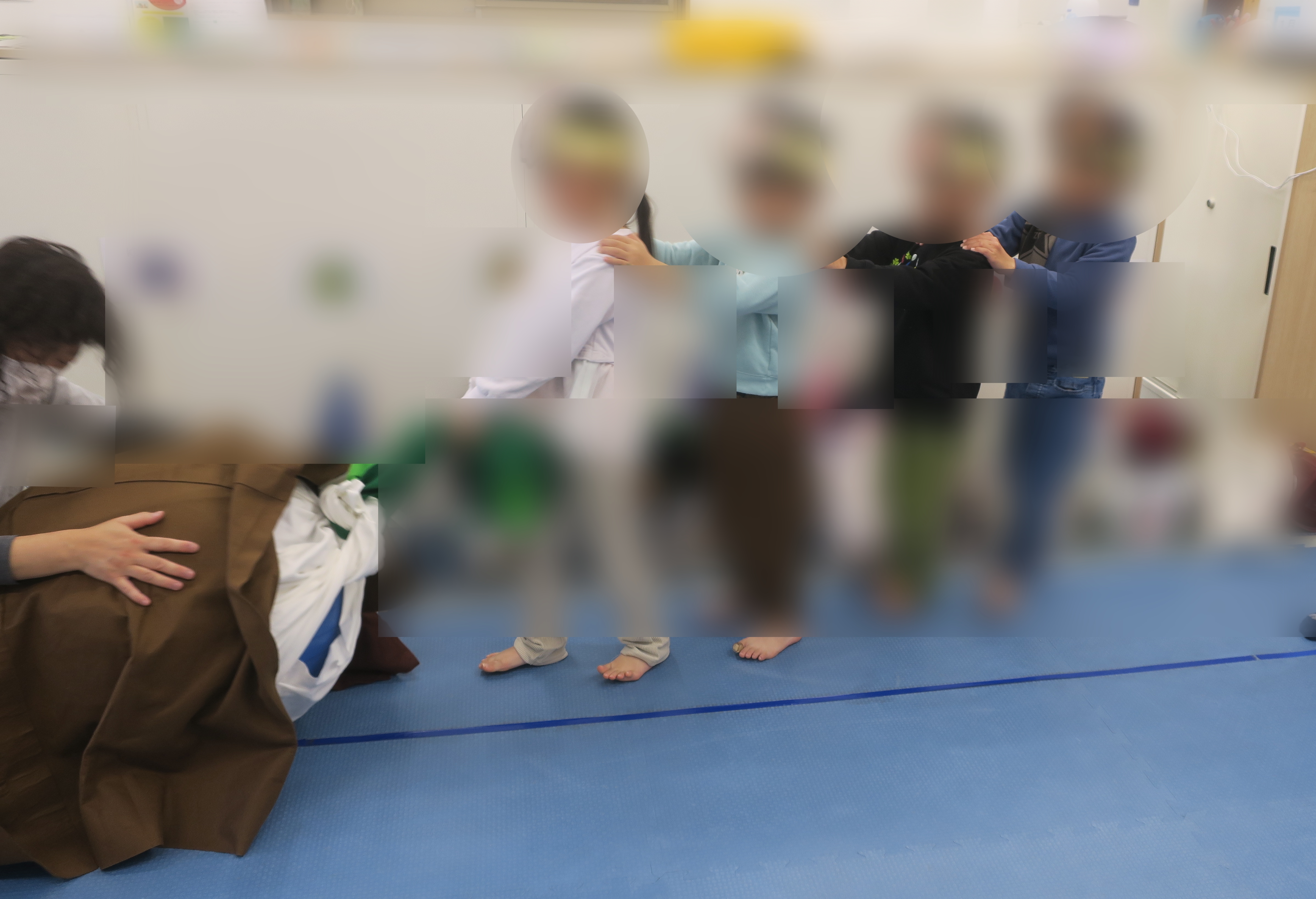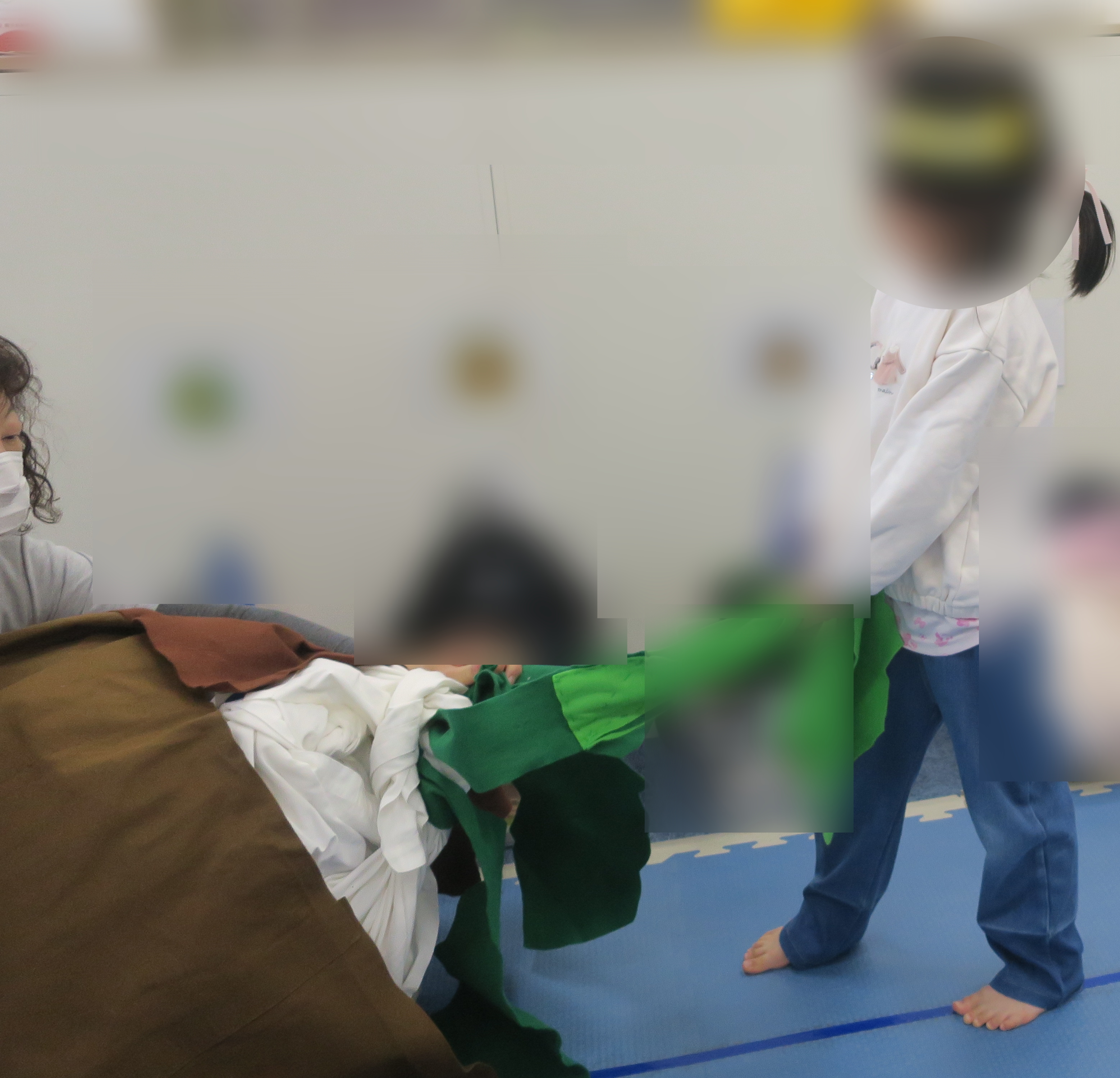 「それでもかぶは抜けません」というジャスチャーをしたり、「おばあさーん」「いぬさーん」と助けを呼んだり、かぶが抜けたらみんなで喜ぶなど、役になり切って楽しく遊ぶことができました。