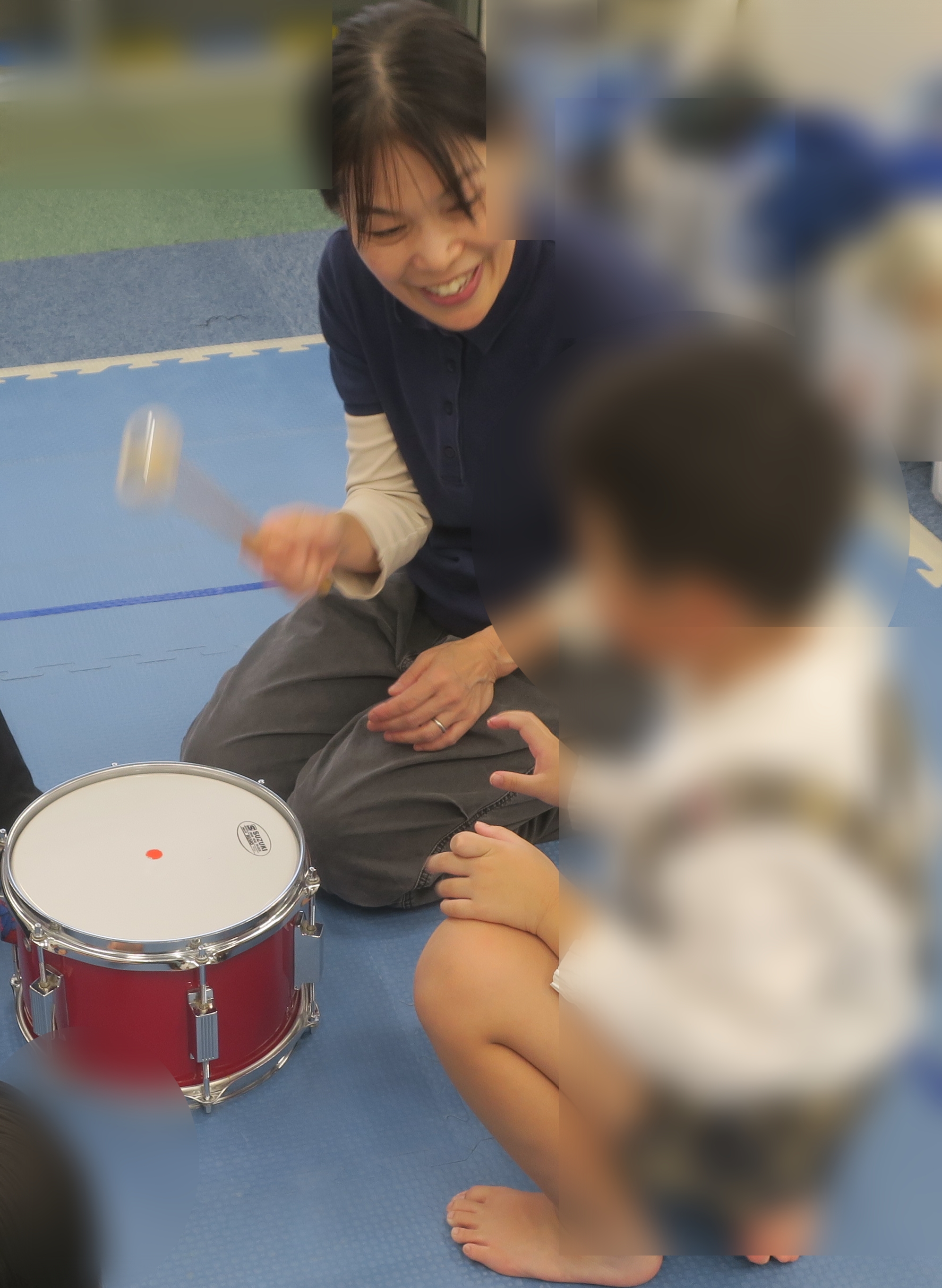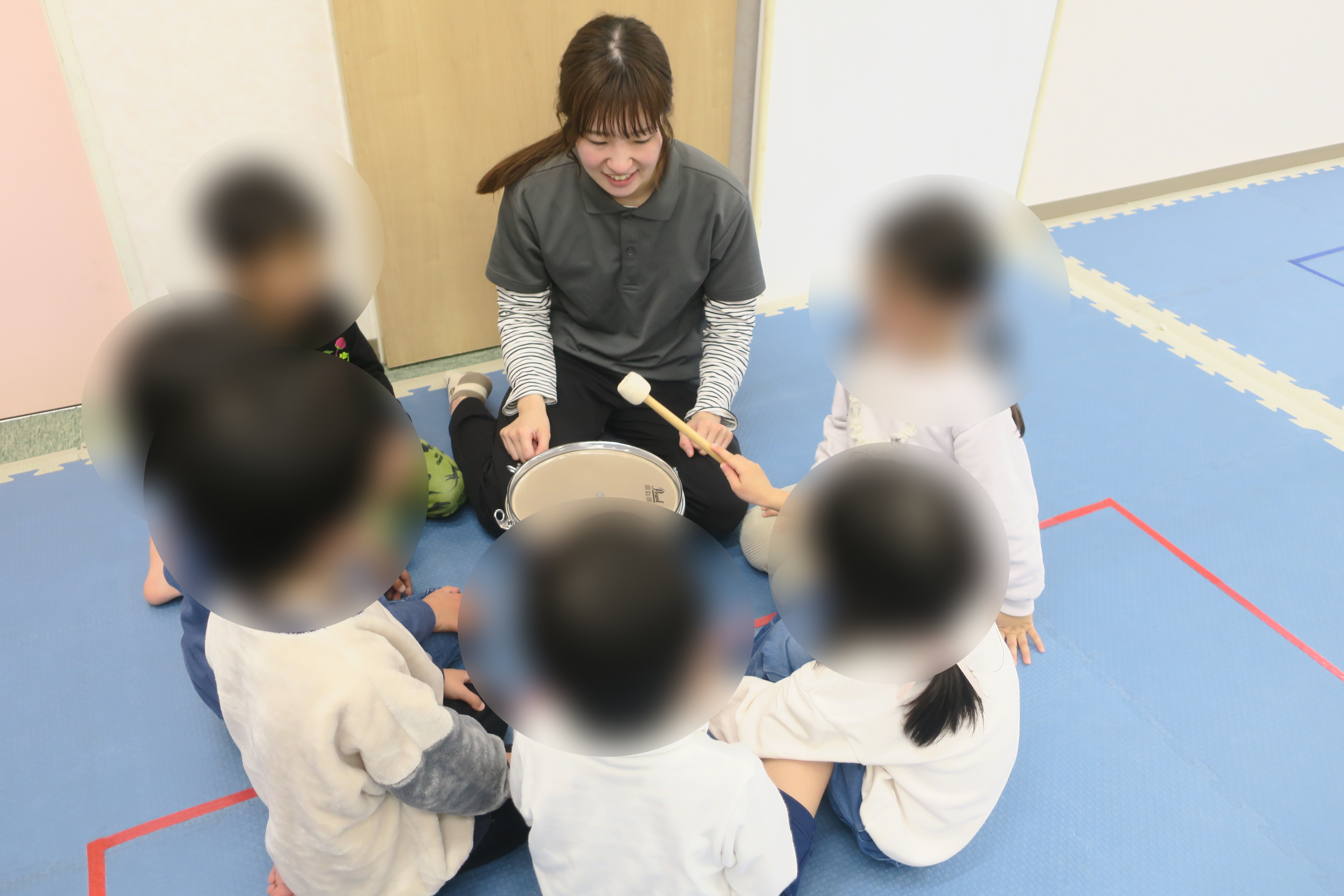 音楽に合わせて「ちょうどいい音はどれくらいかな?」と考えながら、順番に太鼓を叩きます。優しい音色が響き、ゆったりとした時間になりました🥁