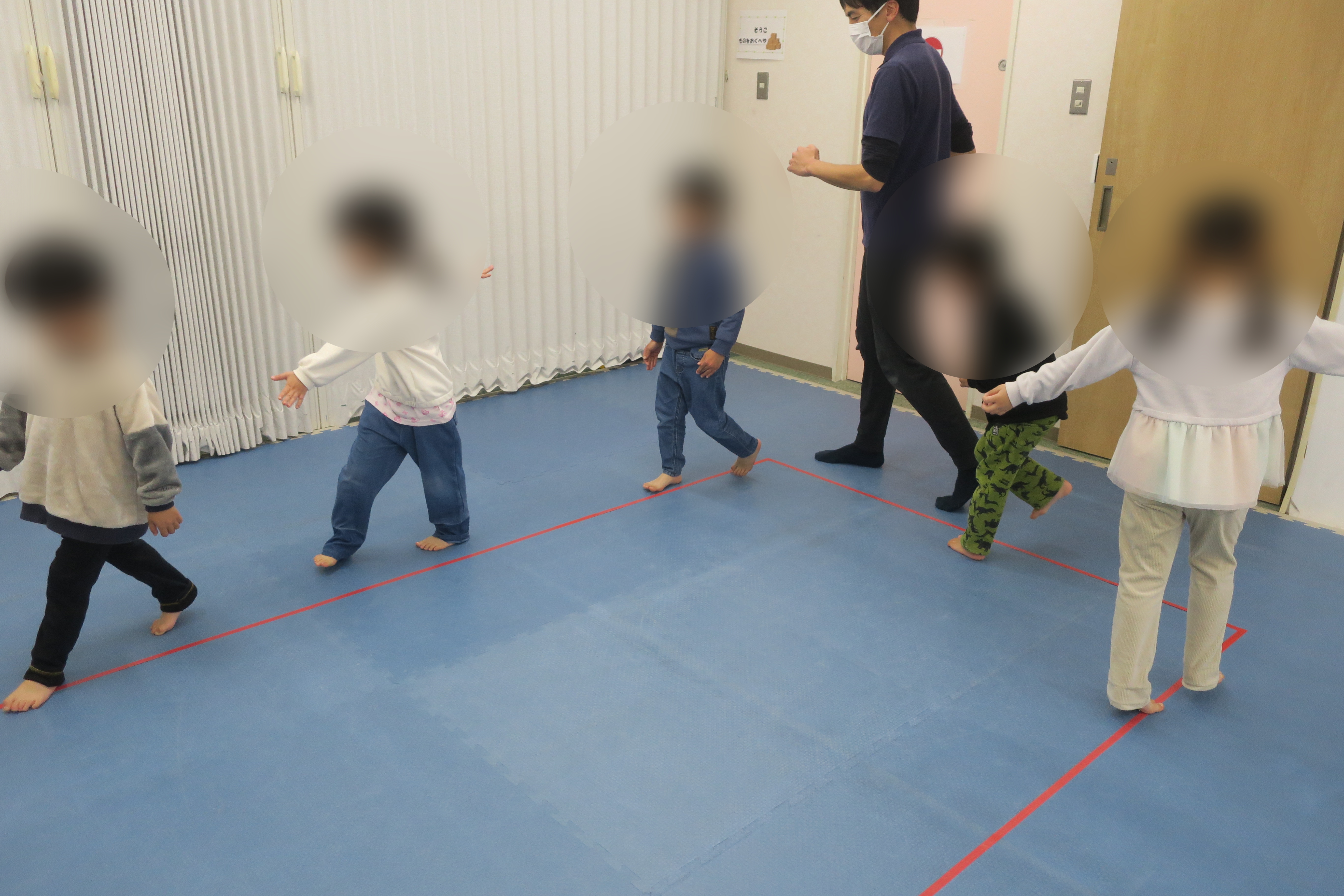次は、音楽に合わせて行進です!歩いたり走ったり、「ピタッ!」と止まることもできましたよ。